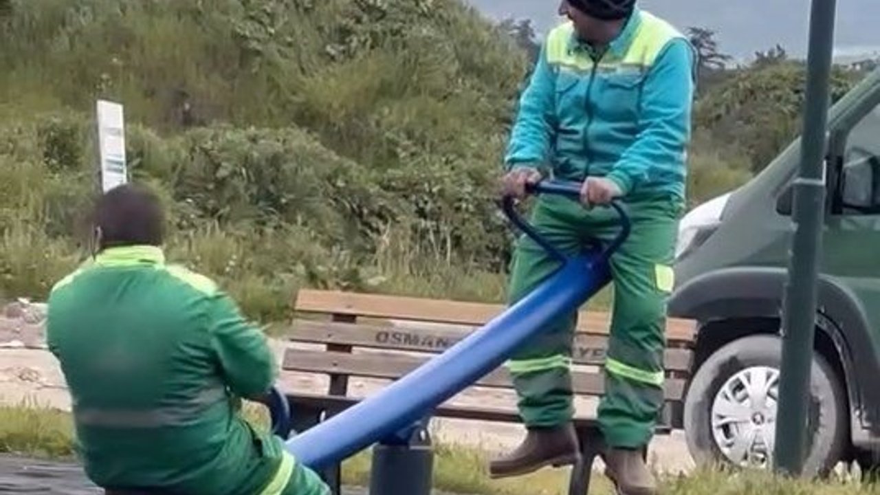 Osmangazi Belediyesi Temizlik İşleri Müdürlüğü’nde görevli Enes Akbulut ile Gülamir Taş (48), görev sahalarındaki Yunuseli Mahallesi’nde çocuk oyun parkını temizledikten sonra mola verdi. Dinlenmek için bank yerine tahterevalliyi tercih eden Akbulut ile Taş, dakikalarca eğlenip, adeta çocukluklarına döndü. Günün iş stresini ve yorgunluğunu çocuk gibi eğlenerek atan işçileri bir mahalle sakini cep telefonuyla görüntüledi. Osmangazi Belediye Başkanı Erkan Aydın, görüntüyü sanal medya hesabından, “Kentimizi güzelleştiren emek sadece çalışmakla değil, yüzlerdeki tebessümle de büyüyor. Temizlik İşleri ekip arkadaşlarımızın bu güzel anı, işlerine kattıkları gönül ve enerjinin en güzel göstergesi. İyi ki varsınız, iyi ki bu kente birlikte değer katıyoruz” mesajını paylaştı.